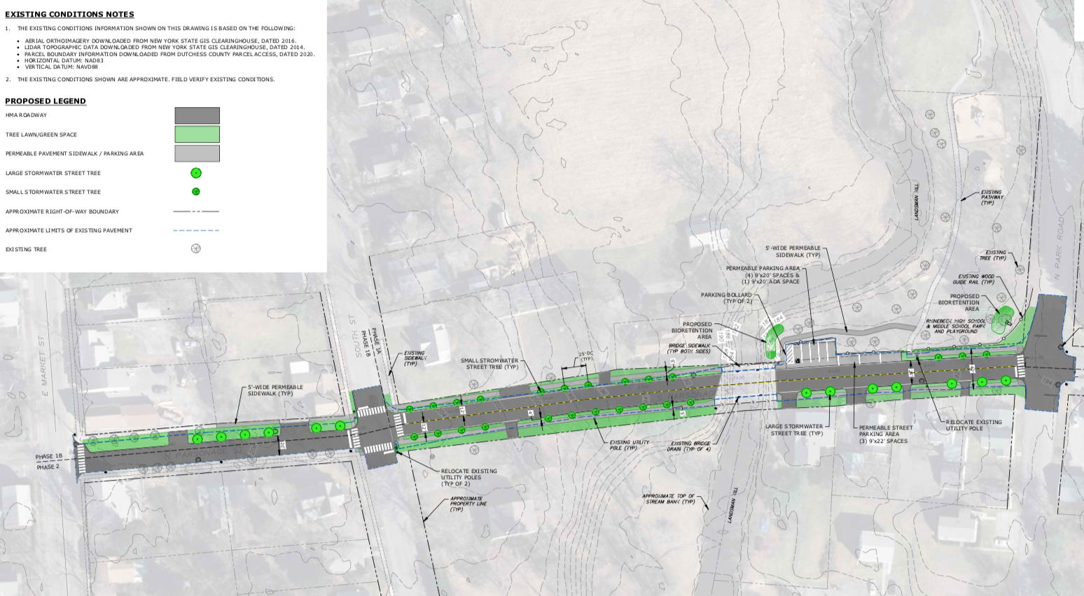 As a demonstration project for this new direction, the Village Board worked with Tighe and Bond on a feasibility study and concept plan. The project, which has a phased plan, would run along S. Parsonage St and the Lions Mini Park. Such a highly trafficked stretch, with one of the Village’s few green spaces, right on the way to the schools, represents a prime opportunity to engage with the school and community about these new green infrastructure and engineering practices and how this direction improves our natural systems. Other co-benefits, such as traffic calming and safer intersections, bolster the walkability and bikeability of this area.